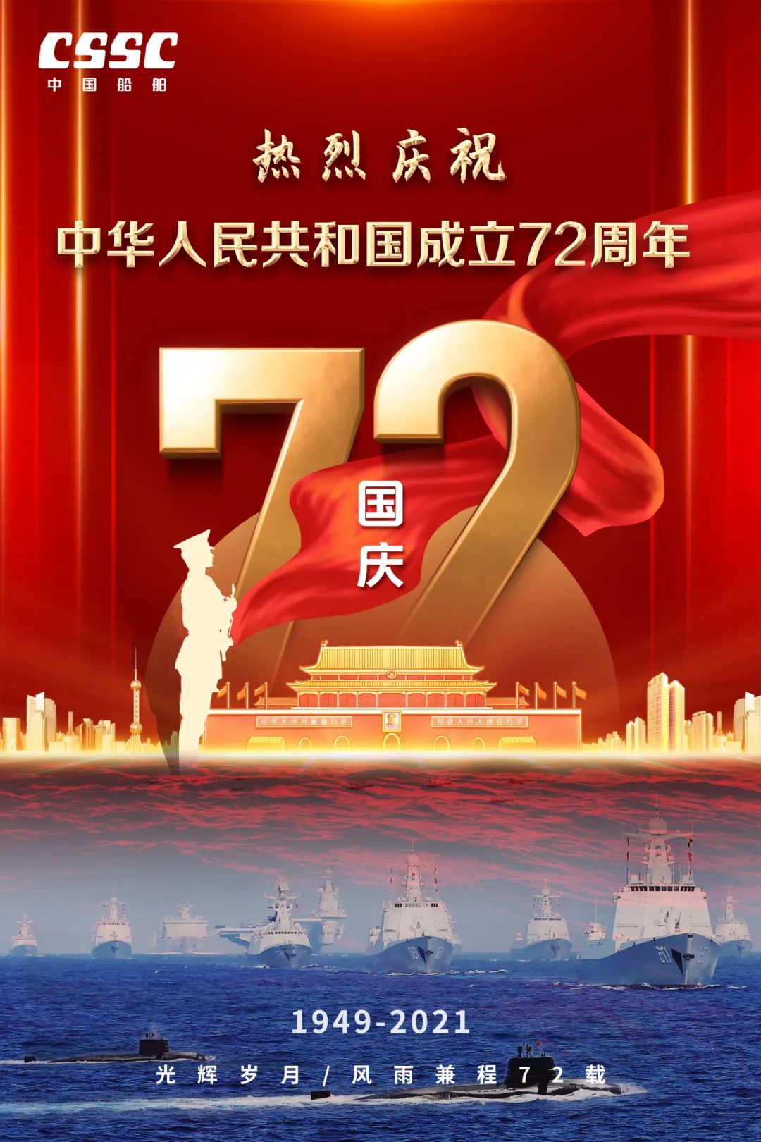 今天,我們迎來新中國72周年華誕。作為我國海軍裝備建設的主力軍,中國船舶大船集團將不忘初心,牢記使命,堅定貫徹海洋強國、制造強國、科技強國國家戰略,聚焦主責主業、聚力興裝強軍,為實現中華民族偉大復興的中國夢而不懈奮斗。