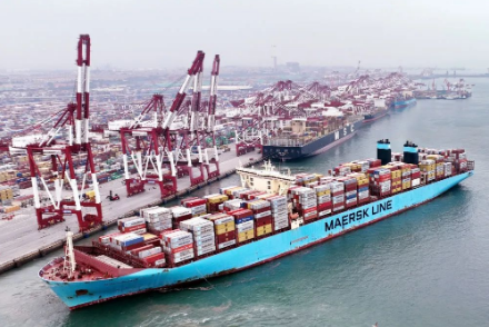 ▲在山東港口青島港前灣碼頭,歐洲貿(mào)易航線的“美途馬士基”集裝箱貨輪解纜起航(2022年7月29日攝,無人機(jī)照片)。新華社記者 李紫恒 攝