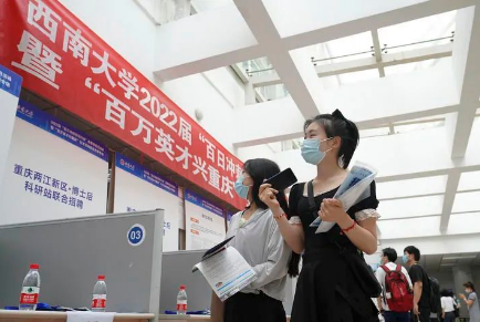 圖片▲在位于重慶市北碚區(qū)的西南大學(xué),應(yīng)屆畢業(yè)生參加“百萬英才興重慶”招聘會(2022年5月13日攝)。用人單位提供了涉及教育、人工智能、汽車制造等領(lǐng)域的3000多個崗位供畢業(yè)生選擇。新華社發(fā)(秦廷富 攝)