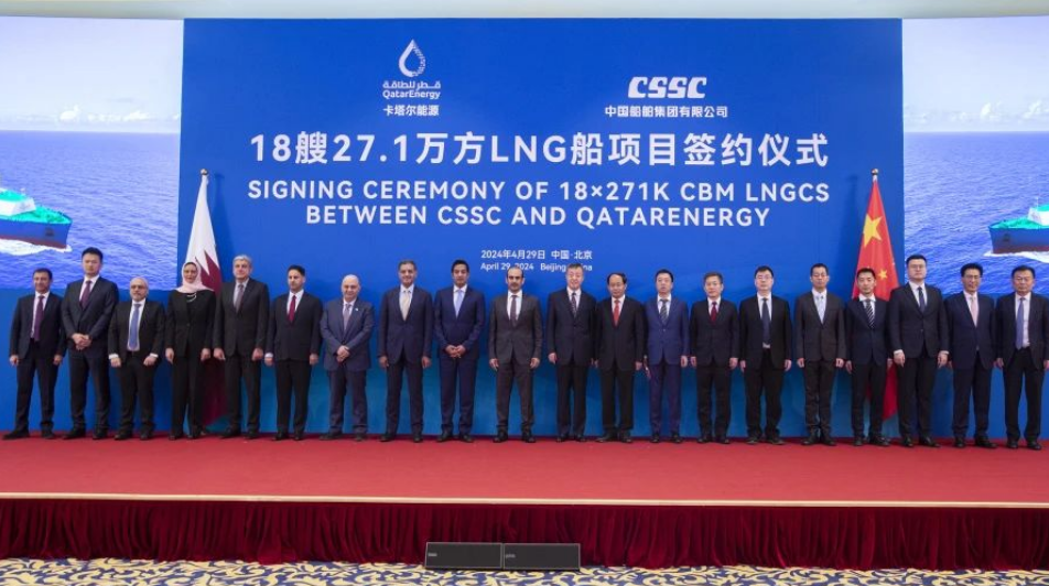 4月29日,中國船舶集團有限公司與卡塔爾能源在京舉行18艘全球最大27.1萬立方米超大型液化天然氣(LNG)運輸船項目簽約儀式。工業和信息化部副部長單忠德,外交部西亞北非司大使呂健,中國船舶集團董事長溫剛、副總經理盛紀綱,卡塔爾能源事務國務大臣、卡塔爾能源總裁兼首席執行官薩阿德·謝里達·阿爾卡比,卡塔爾能源天然氣首席執行官卡利德·阿爾-塞尼,卡塔爾能源商務和業務發展執行副總裁賈西姆·阿爾馬拉祖齊等領導和嘉賓出席簽約儀式。