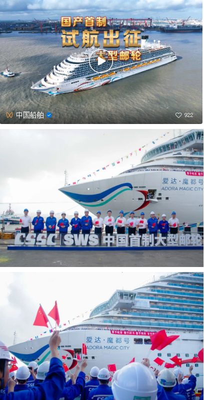 自2019年10月首艘國產(chǎn)大型郵輪開工建造以來,中國船舶集團(tuán)及相關(guān)成員單位深入貫徹落實習(xí)近平總書記重要指示批示精神和黨中央決策部署,通過引進(jìn)消化和自主創(chuàng)新,相繼開展了郵輪設(shè)計、建造、項目管理等專項攻關(guān),項目工程穩(wěn)步推進(jìn),各項節(jié)點順利完成,一系列科技創(chuàng)新成果落地開花。預(yù)計首制船將于今年底完工交付。