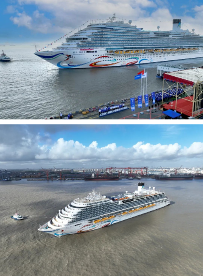 7月17日清晨7時許,隨著中國船舶集團(tuán)有限公司黨組書記、董事長溫剛一聲令下,白色涂裝、流線型船體、身系“敦煌飛天彩帶”的首艘國產(chǎn)大型郵輪“愛達(dá)·魔都號”緩緩駛出中國船舶集團(tuán)外高橋造船4號碼頭,正式出海試航。集團(tuán)公司黨組成員、副總經(jīng)理盛紀(jì)綱出席試航出征儀式并致辭。