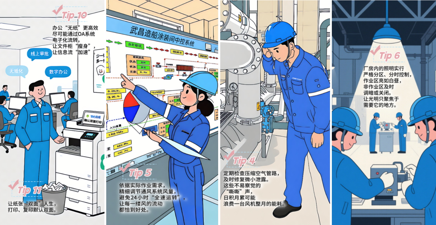 武昌造船在節(jié)能宣傳周期間組織開展了“船廠節(jié)能秘籍”征集活動,以船廠員工的一天為軸線,收集到各類節(jié)能基本操作,形成了《這些基本操作,我知道你一定能做到》宣傳材料,并通過公司公眾號發(fā)布,向員工普及節(jié)能知識與技巧,擴(kuò)大節(jié)能宣傳覆蓋面。同時開展 “停用空調(diào)”能源緊缺體驗行動,倡議全體員工在全國低碳日,關(guān)閉辦公室、會議室及非必要區(qū)域空調(diào)設(shè)備,通過實際行動感受能源緊缺,踐行節(jié)能理念,進(jìn)一步增強(qiáng)員工資源憂患意識。