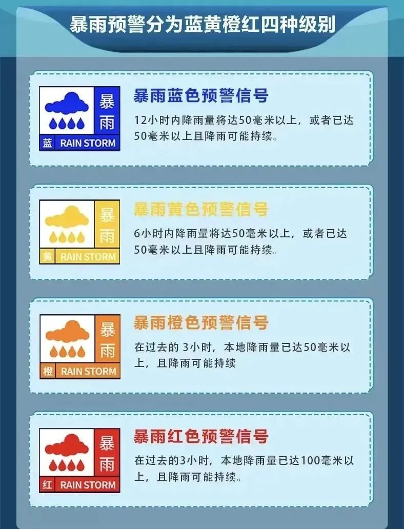暴雨預(yù)警信號(hào)是氣象部門通過氣象監(jiān)測,在暴雨到來之前做出的預(yù)警信號(hào),暴雨預(yù)警信號(hào)分四級(jí),分別以藍(lán)色、黃色、橙色、紅色表示。