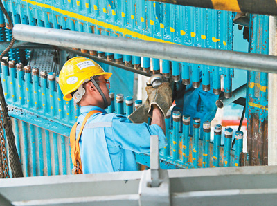 一名中國施工人員正在進(jìn)行鍋爐受熱面打磨對口作業(yè)。本報(bào)記者 劉 剛攝