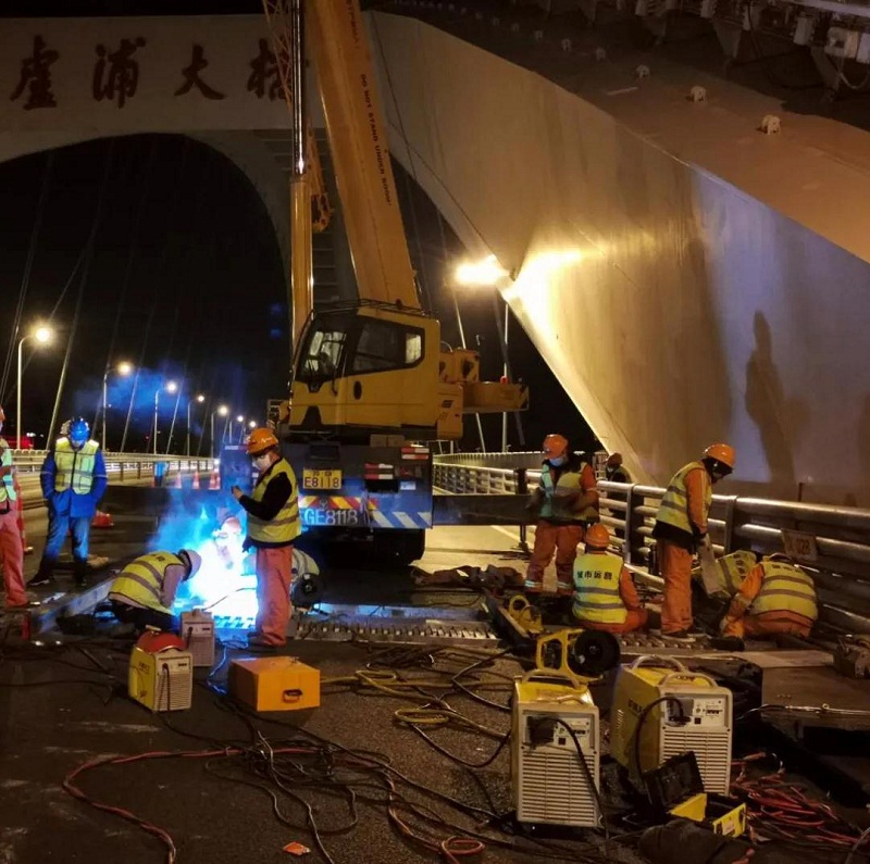 ????此時(shí),來自中國(guó)船舶集團(tuán)所屬上海盧浦大橋投資發(fā)展有限公司的守橋人開工了。近20平方米的施工區(qū)域,人頭攢動(dòng)、焊花飛舞,工人身著的安全背心泛出的熒光,焊槍下閃爍的弧光和橋面的燈光交相輝映。
