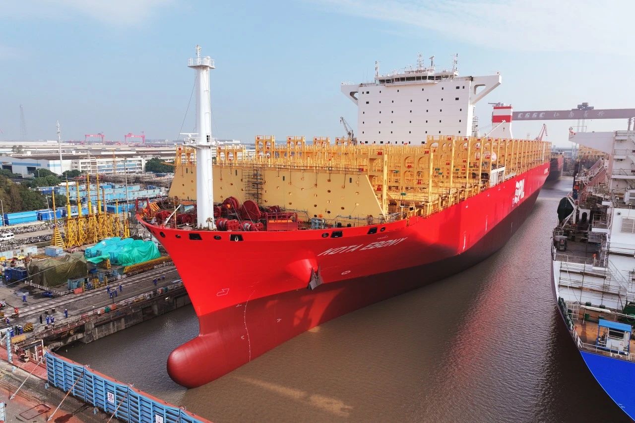 該船為江南研究院自主研發設計的“鯤”系列大型集裝箱船,采用LNG雙燃料動力,是新型高效、綠色、節能環保的船型。