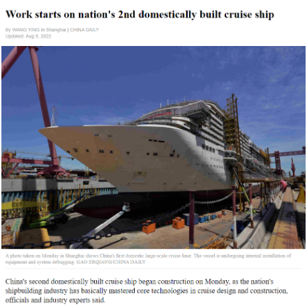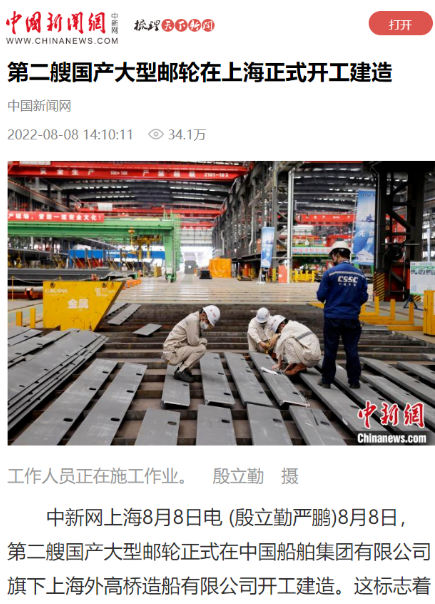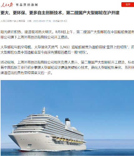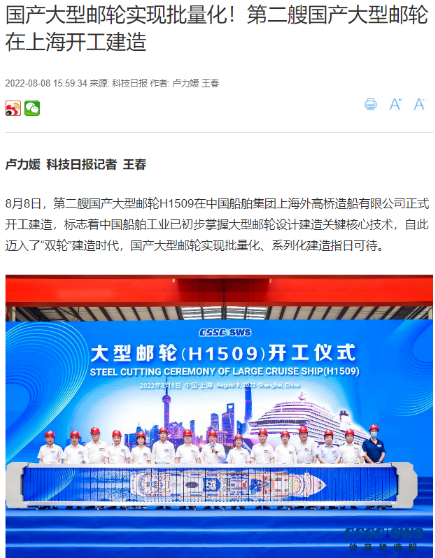 8月8日,第二艘國產大型郵輪在中國船舶集團旗下外高橋造船開建,這標志著中國船舶工業(yè)已初步掌握大型郵輪設計建造關鍵核心技術。
